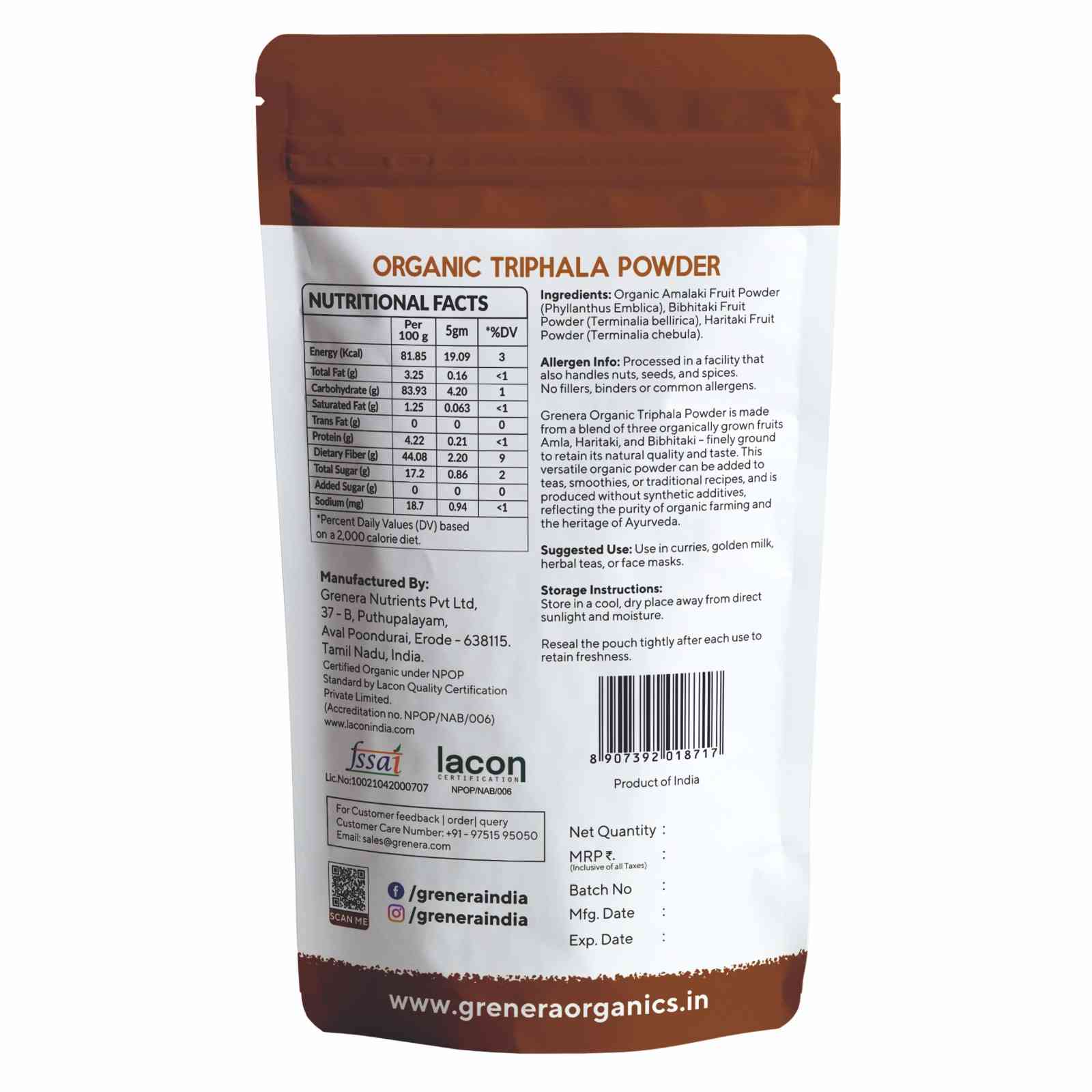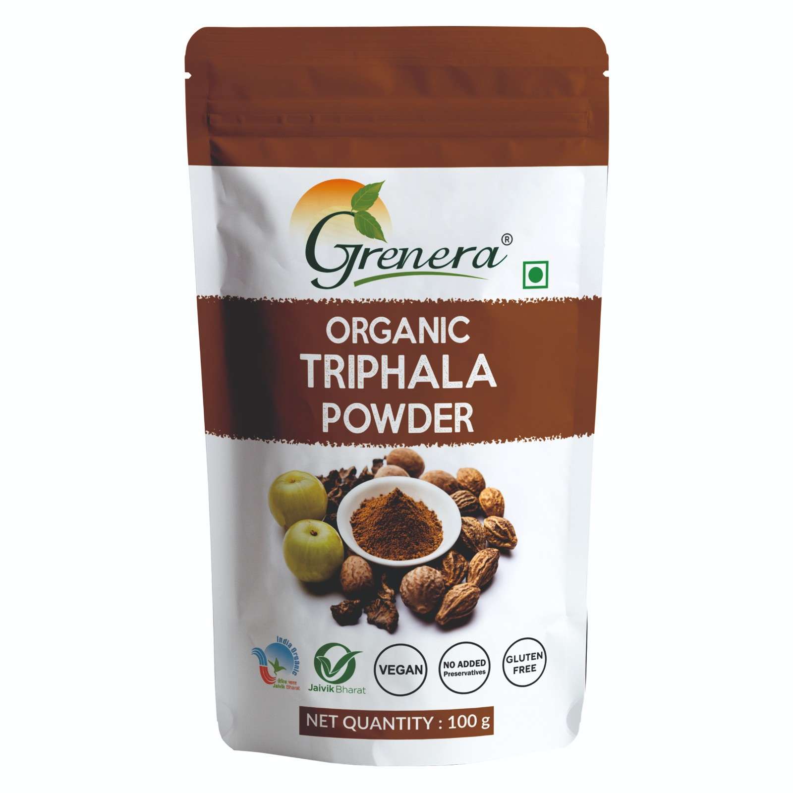 Grenera Organics Triphala powder is carefully blended together using the purest ingredients to bring you very ancient herbal Ayurvedic formula. Triphala- Literally means ‘Three Fruits’. The fruits from three trees (Emblica Officinalis, Terminalia Bellirica, Terminalia Chebula) are powdered and blended according to an ancient Ayurvedic herbal formula. Grenera Organics Triphala powder has innumerable benefits. Triphala is made from a traditional combination of three myrobalan fruits: Amalaki, Haritaki and Bibhitaki. Triphala is a complete balanced energy formula which are required for our proper body mechanism. Amalaki is a rich source of vitamin C and also contains polyphenols. Haritaki contains calcium, magnesium and potassium. Bibhitaki contains several triterpenoids. The combination of amalaki, haritaki and bibhitaki will make our life healthy when consumed regularly.