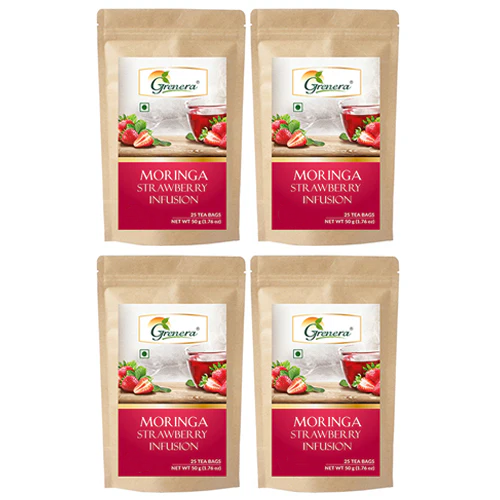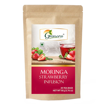 Grenera Moringa Strawberry Infusion is made with moringa leaves, Strawberry pieces. The red strawberries have been the most favorite fruit of the world. We blend dried strawberry pieces with African grown Hibiscus petal and the nutritious Moringa leaves to make a perfect strawberry tea. Moringa strawberry tea is a sweet, refreshing drink with a delicious fruit flavor.