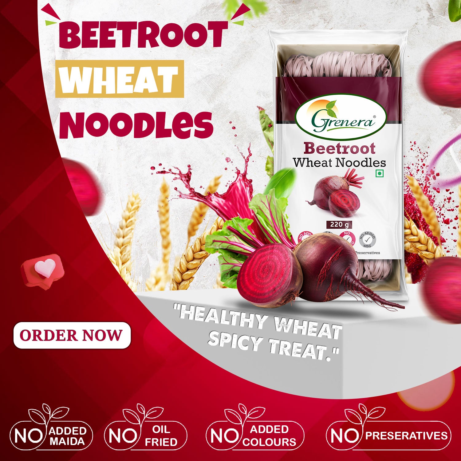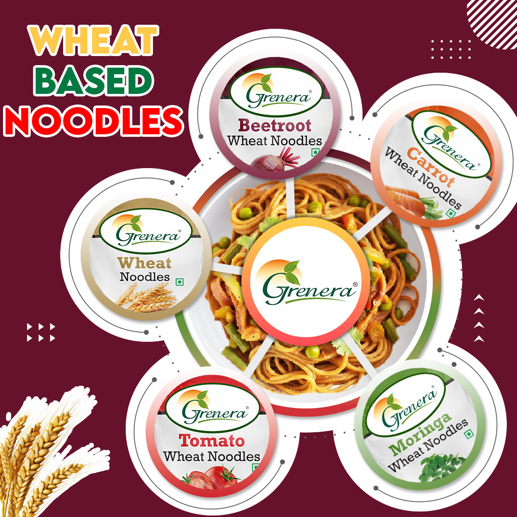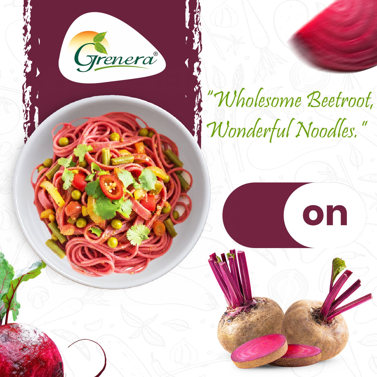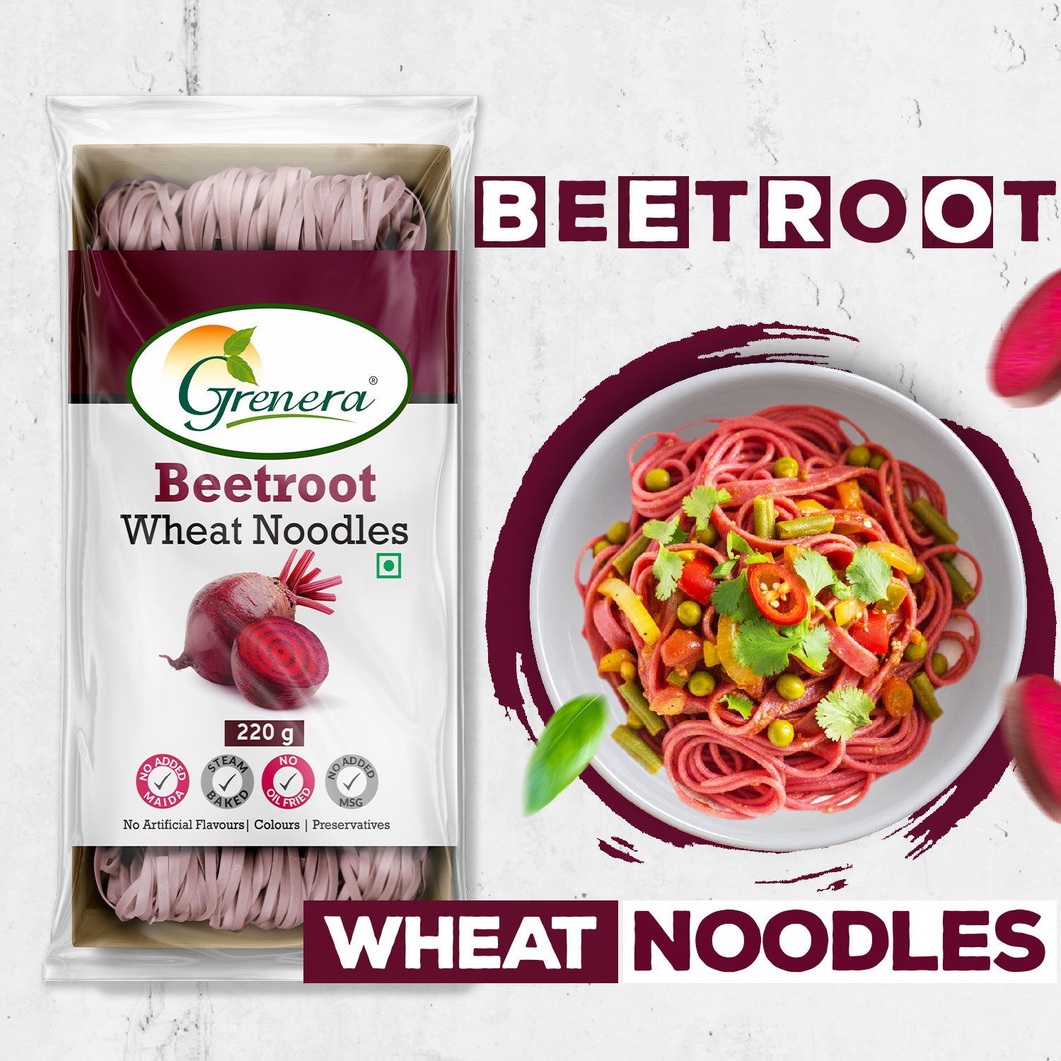 VEGETABLE NOODLES: We make authentic vegetable noodles by mixing the Fibre rich whole wheat flour with real vegetables and make Noodles. Our beetroot Noodles contain 75% wheat flour mixed with freshly squeezed beetroot Pulp added with a pinch of salt and Nothing else.