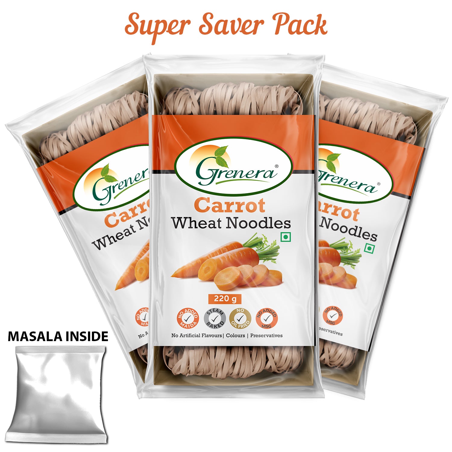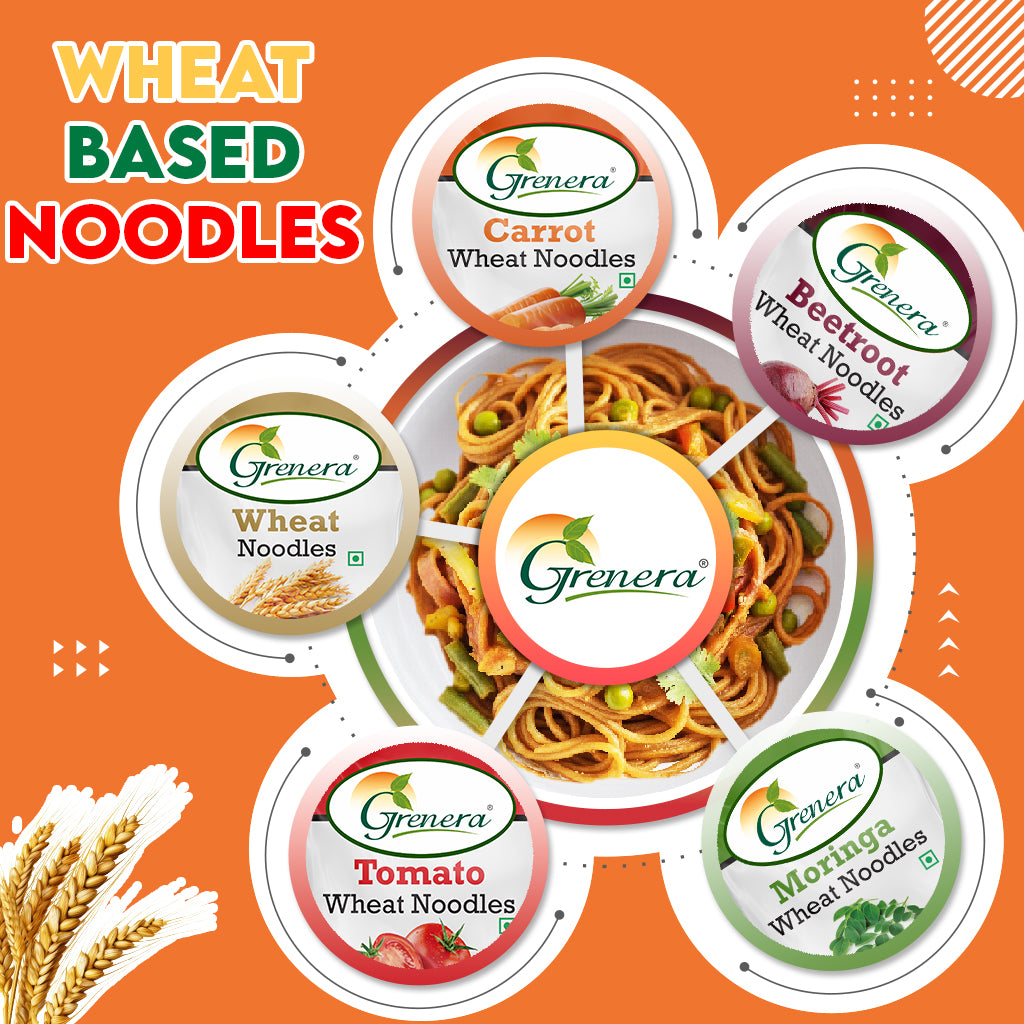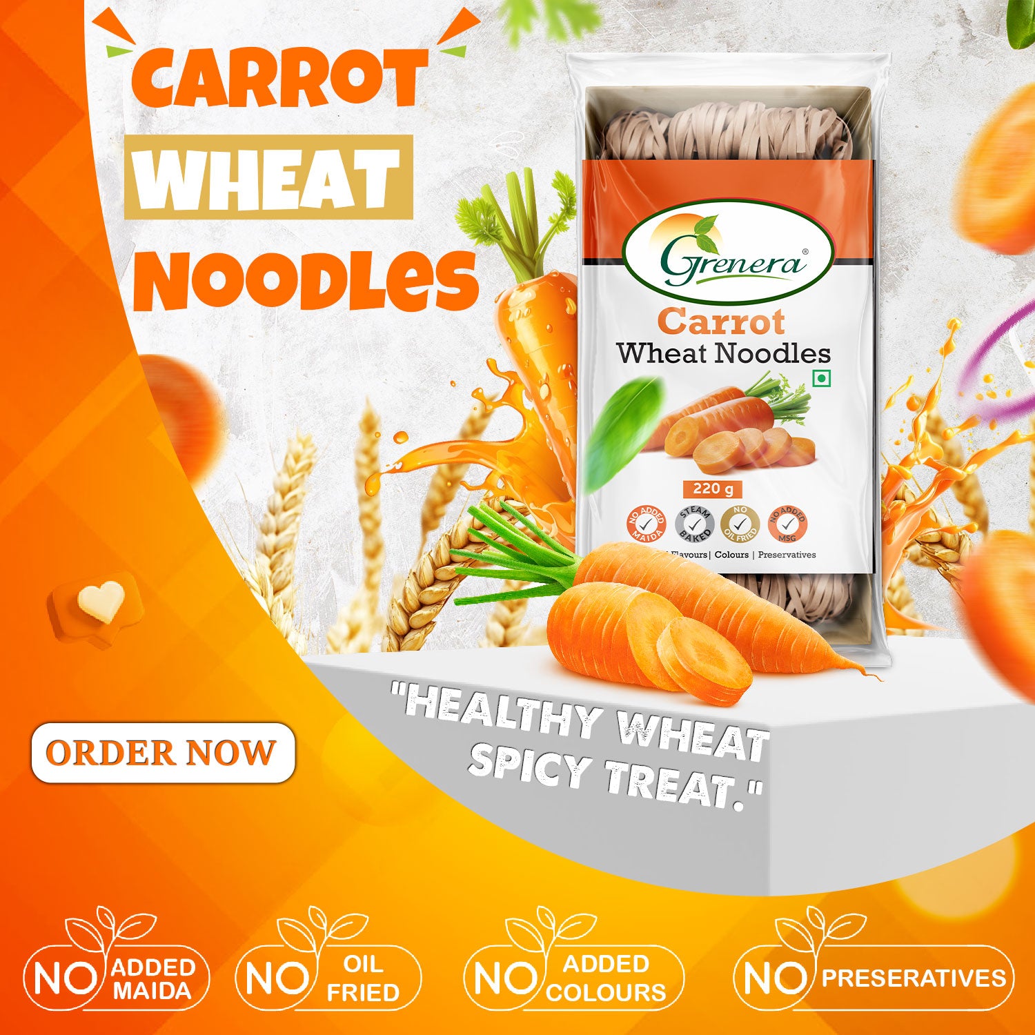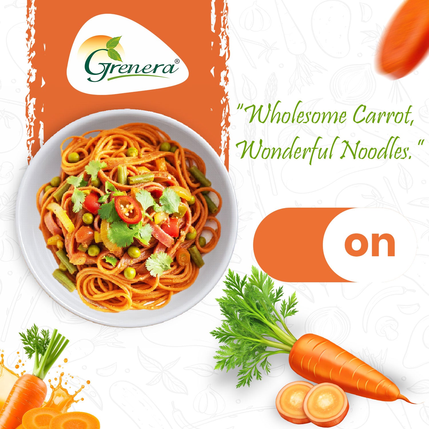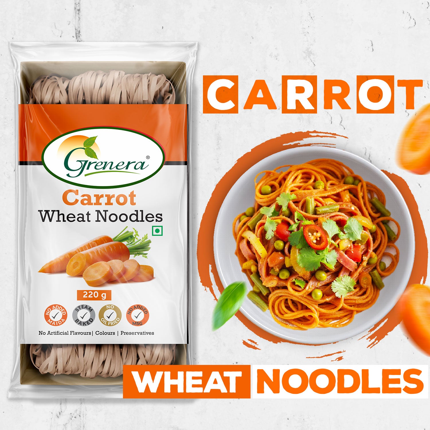 VEGETABLE NOODLES: We make authentic vegetable noodles by mixing the Fibre rich whole wheat flour with real vegetables and make Noodles. Our Carrot Noodles contain 75% wheat flour mixed with freshly squeezed Carrot Pulp added with a pinch of salt and Nothing else.