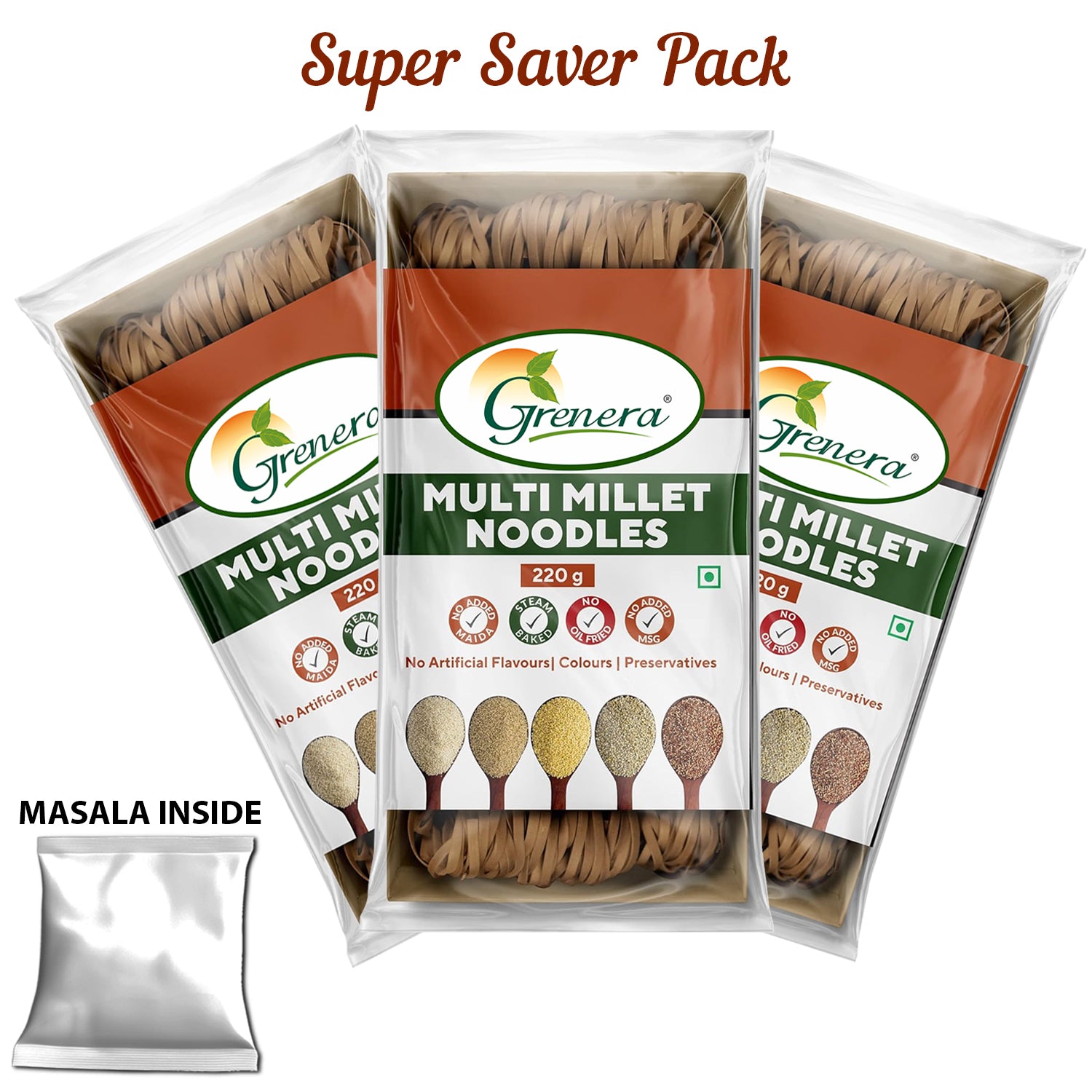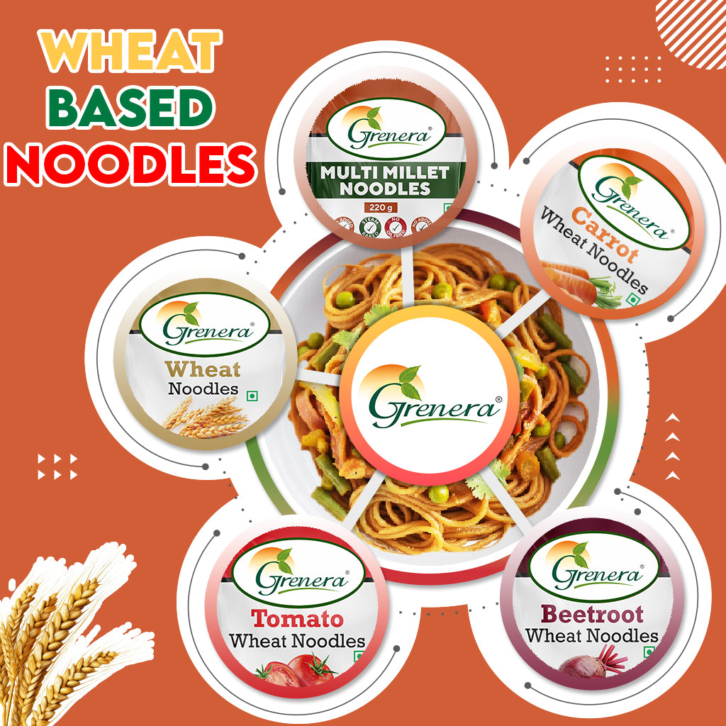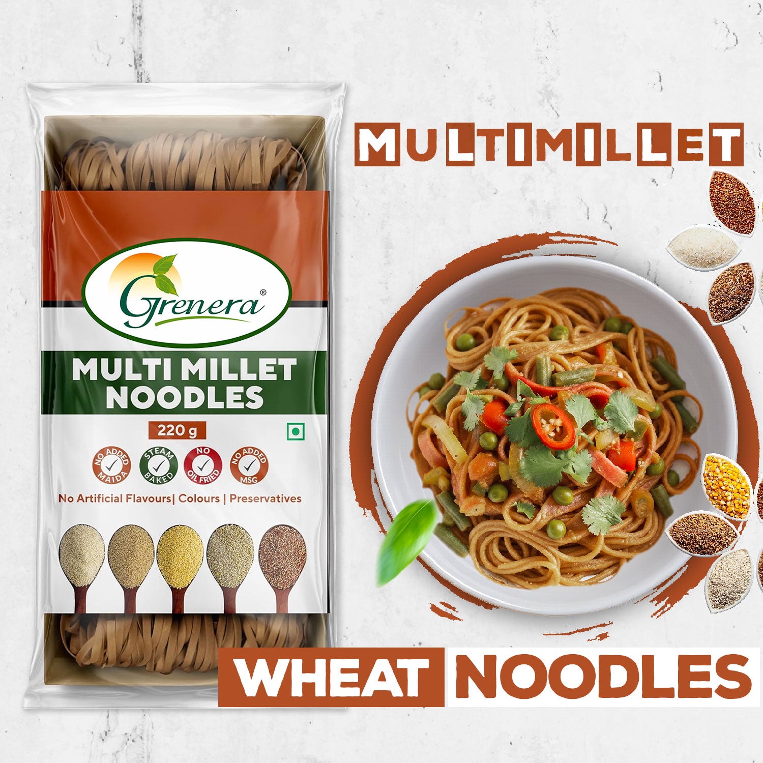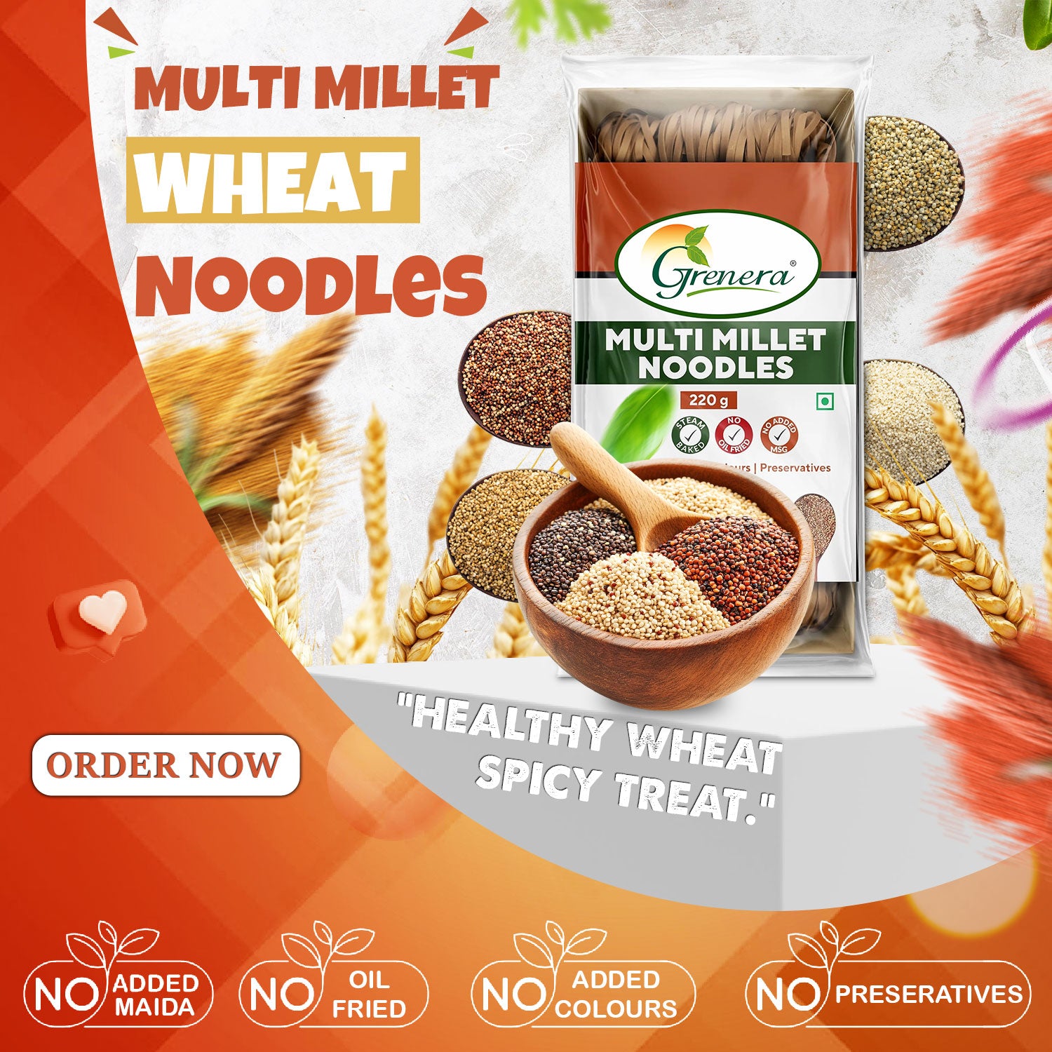 MULTI MILLET NOODLES: We make authentic multi millet noodles by mixing the Fibre rich whole wheat flour with finger millet, kodo millet, pearl millet, foxtail millet, little millet and make Noodles. For instance, our Multi Millet Noodles contain various millet and wheat flour added with a pinch of salt and Nothing else.