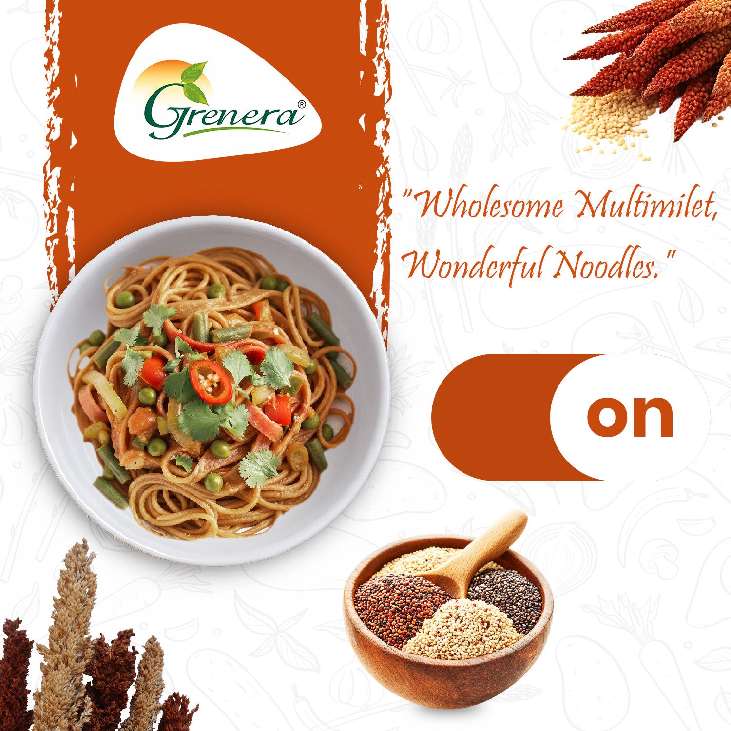 SUGGESTED USE: Boil 1.5 litre water for 5 to 6 minutes. Add 200g Grenera multi millet noodles and a spoon of oil and boil for further 6 minutes. Filter excess water in boiled noodles and add cold water to it. Ten drain the water. Add oil in a hot pan and fry the chopped onions, capsicum carrot and beans. Add noodles masala and salute on medium flame. Then add boiled grenera noodles along with it and salute well. If necessary as a required amount of salt.
