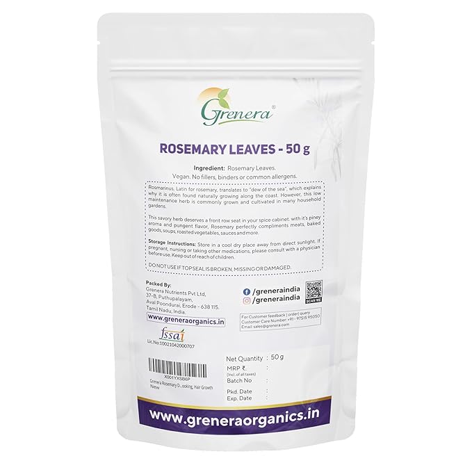Grenera Rosemary Dried Leaves are carefully handpicked and naturally dried to preserve their strong aroma and rich essential oils. Rosemary is a fragrant herb widely used in Mediterranean cooking and wellness practices. It adds a refreshing flavor to soups, sauces, salads, and roasted dishes while also offering natural antioxidants that support digestion, memory, and overall health.