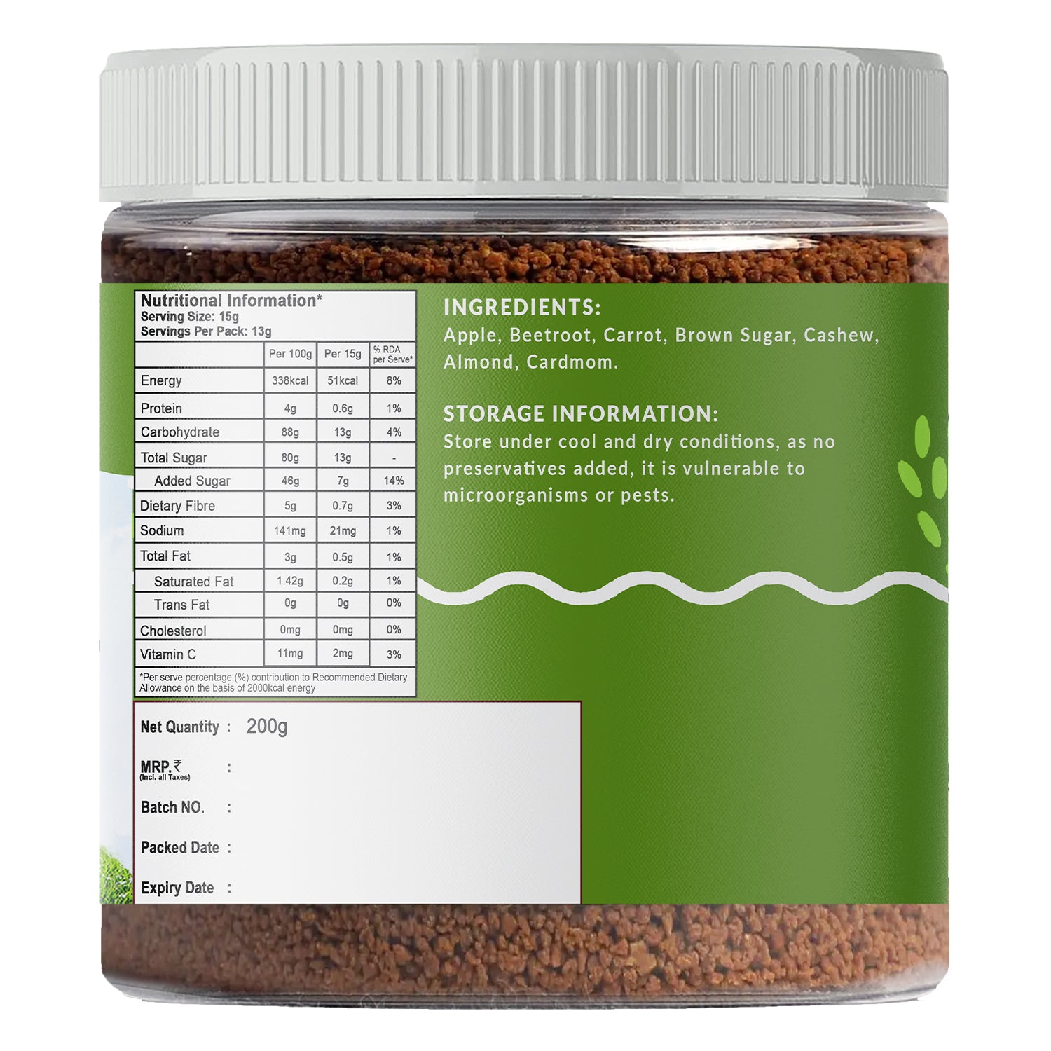 Apple powder, beetroot powder, carrot powder, malted grains, dry fruits, and natural sweeteners.