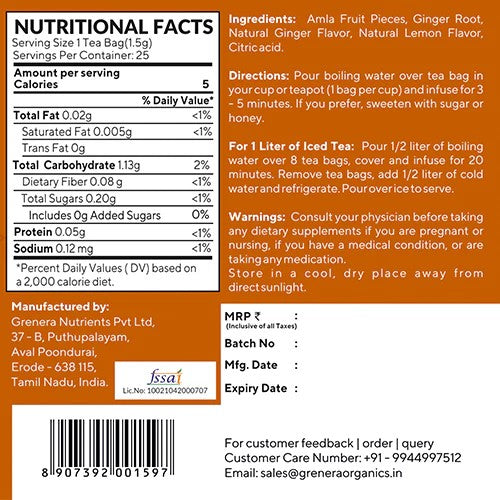 INGREDIENTS - Amla Fruit Pieces, Ginger Root, Lemongrass, Licorice Root and Natural Lemon and Ginger Flavor.
