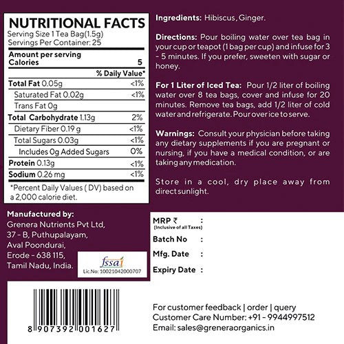 Grenera Hibiscus Ginger infusion is a perfect blend of naturally grown Hibiscus Flowers and Ginger root. The infusion is made from the combination of herbal blends and provides the soothing effect after sipping the drink. Hibiscus is a tropical flower that thrives in the hot climates. Hibiscus is rich in nutrients. Our hibiscus petals are from egypt which are cultivated from fertile nile valleys of egypt. Hibiscus tea unique flavor and a bouquet of potential health benefits.