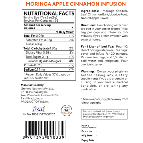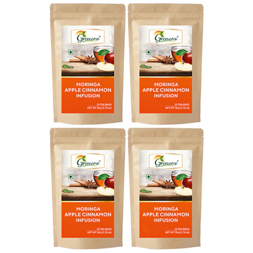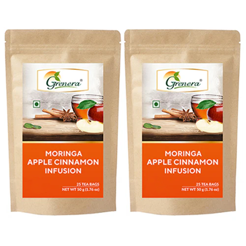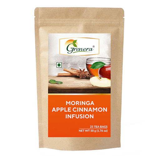 Grenera Moringa Apple Cinnamon Infusion is made with moringa leaves, Cinnamon and Natural Apple flavor. The cinnamon pieces sources from South East Asia and the Himalayan grown apple pieces blended with the nutritive Moringa leaves offers a wonderful blend of Moringa Apple Cinnamon Infusion. This infusion has a natural sweet taste and is served during special family occasions.