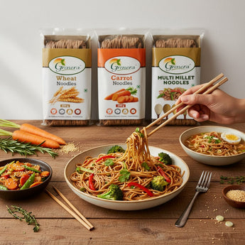 Wholesome, tasty, and power-packed! Our Wheat & Carrot Multi-Millet Noodles bring together the natural goodness of whole wheat, nutritious carrots, and a blend of ancient millets. A perfect maida-free choice for health-conscious families who love quick, delicious meals.