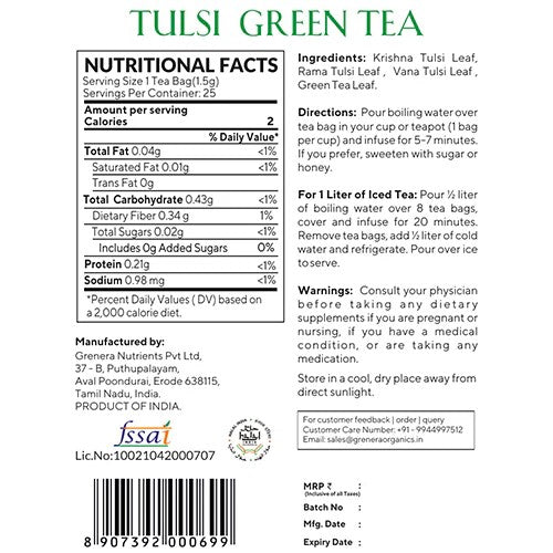 Grenera Tulsi Green Tea made with naturally grown Tulsi leaves and Green Tea leaves. Tulsi and green tea are the natural stimulator keeps you calm and relaxed. Every sip of tulsi green tea will lift the spirit by recharging your body and mind. This product is a healthy drink and loved by the health conscious peoples and importantly it's not for tasty freakers.