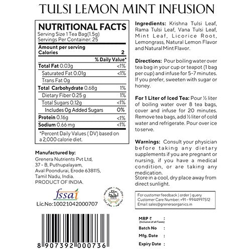 Grenera Tulsi Lemon Mint Infusion is a perfect blend of naturally grown Tulsi leaves, Mint leaves and Lemon pieces. The mint leaves gives a cooling effect soon after the consumption of the beverage. This helps us to offer the freshest infusion to our customers. This product is a healthy drink and loved by the health conscious peoples and importantly it's not for tasty freakers.